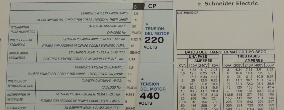 Esta tabla la genera el fabricante Schneider y constituye una guía rápida para la selección de protecciones y cables para cada potencia del motor. Se pueden ver los valores de Corriente a Plena Carga o Corriente Nominal de cada uno de los valores comerciales de potencias de Motor. También podemos ver el calibre mínimo de conductor a utilizar sugerido. El resto de datos ya son muy específicos para cada marca. Esto es para una selección rápida.
